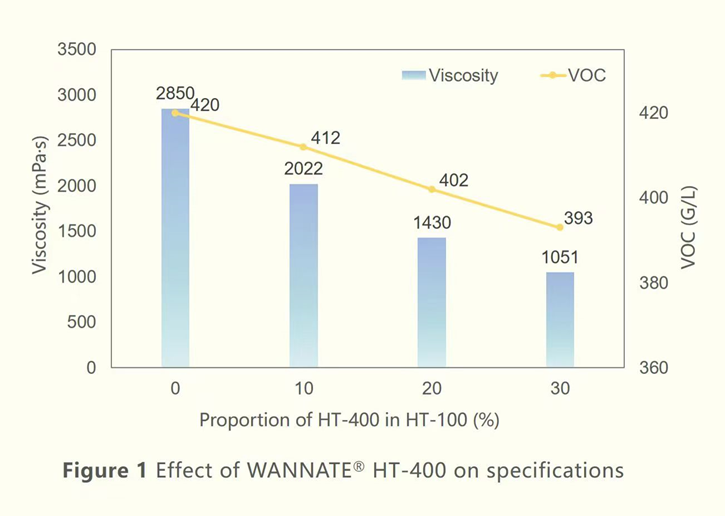 • Solvent-Based 2K PU Coatings: Acting as a reactive diluent, WANNATE® HT-400 dramatically reduces both viscosity and VOC content (Figure 1), improving film appearance and adhesion in certain systems.